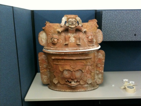 Painted wood and foam, wire, other stuff to make him interesting. 3 ft tall.