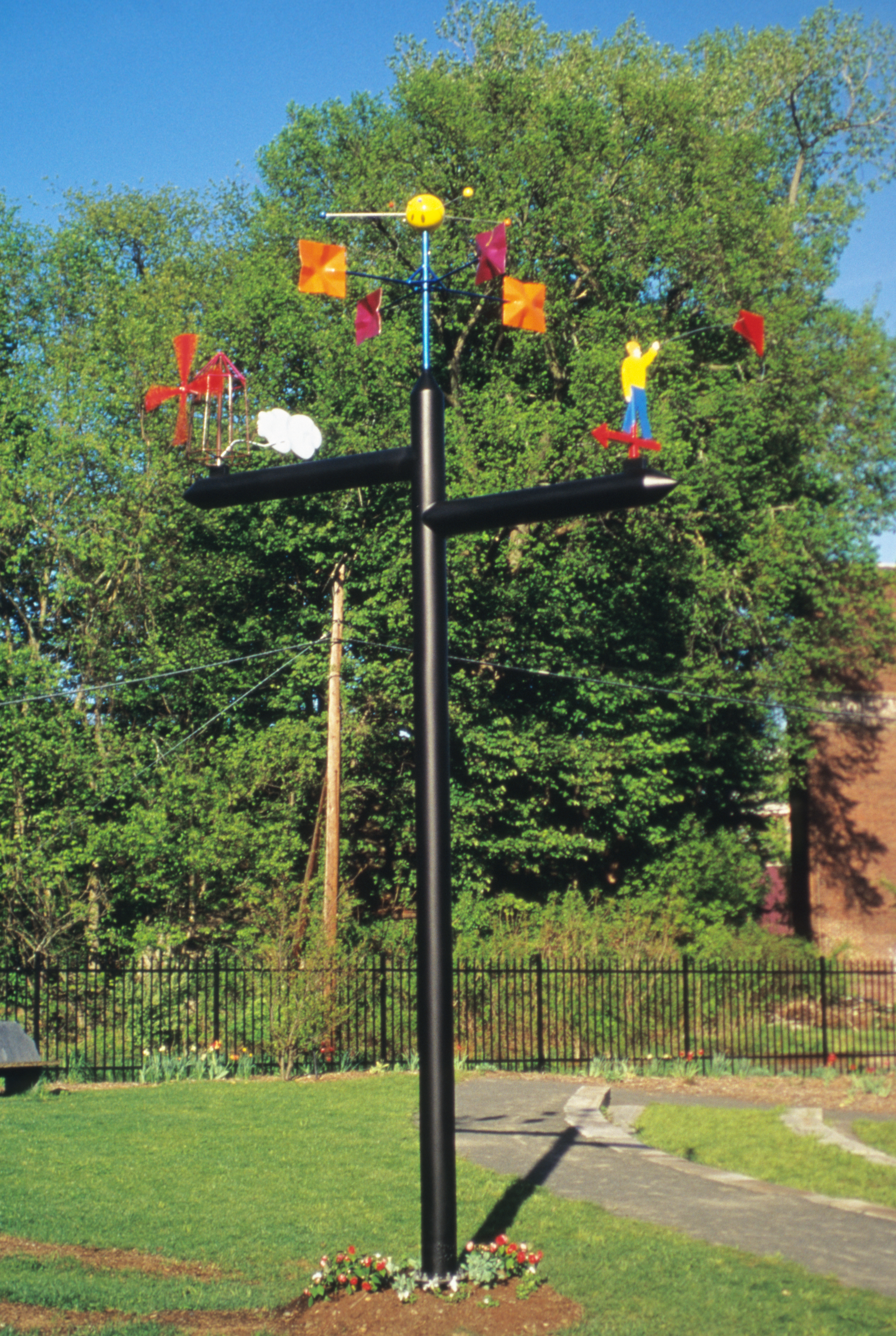 powered. Steel, mixed media, solar powered clock mechanism. 14 ft. high, 1 ft.
