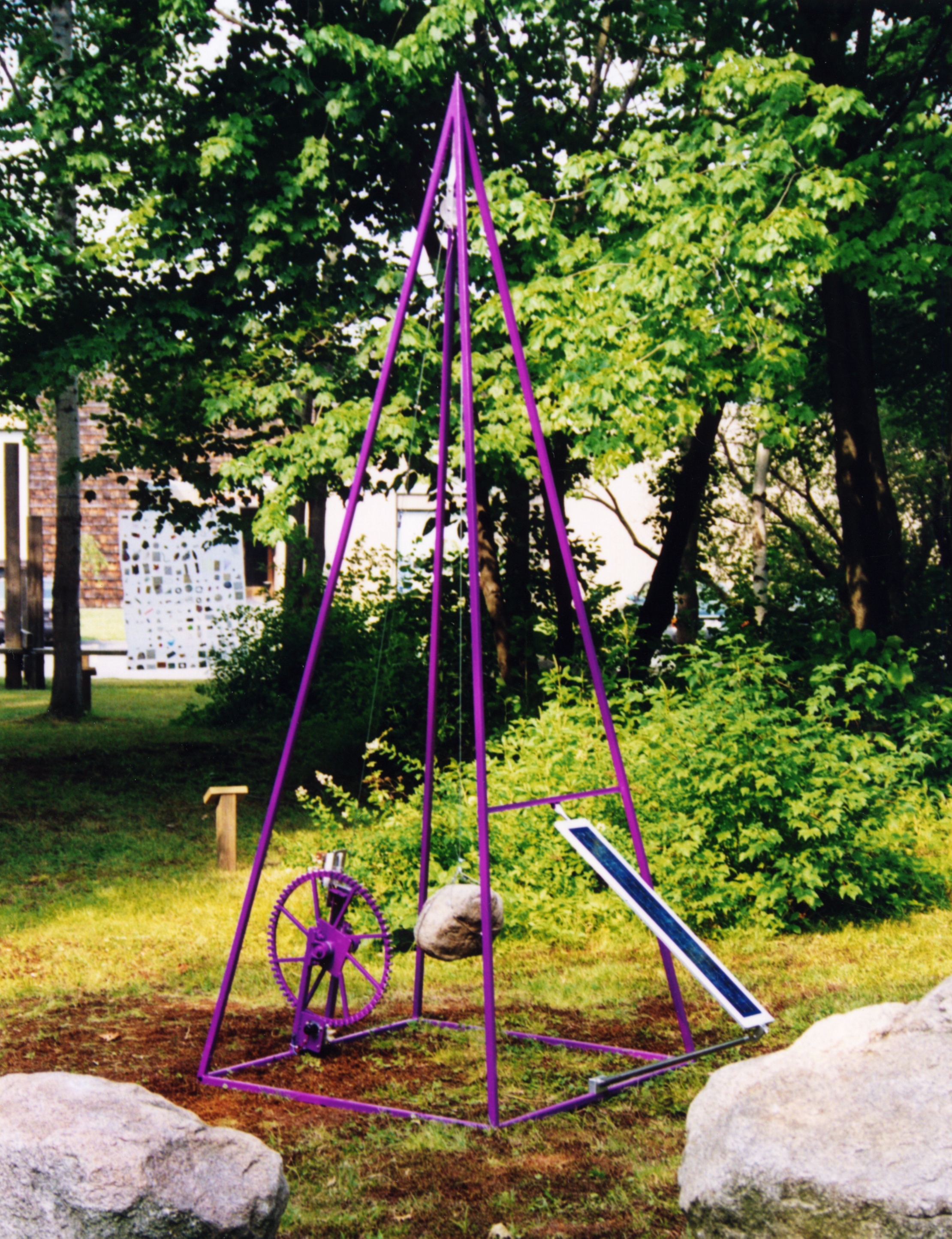solar cells, motor, steel, natural boulder; 12 ft high, 4 ft wide, 4 ft deep.